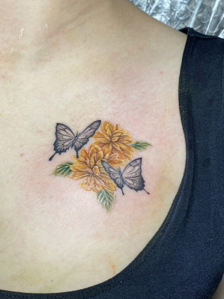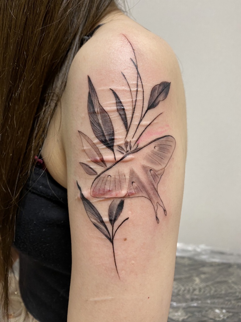 古いタトゥーの上に新たなモチーフを彫ることで過去のリフレッシュを行います。 もっと見る