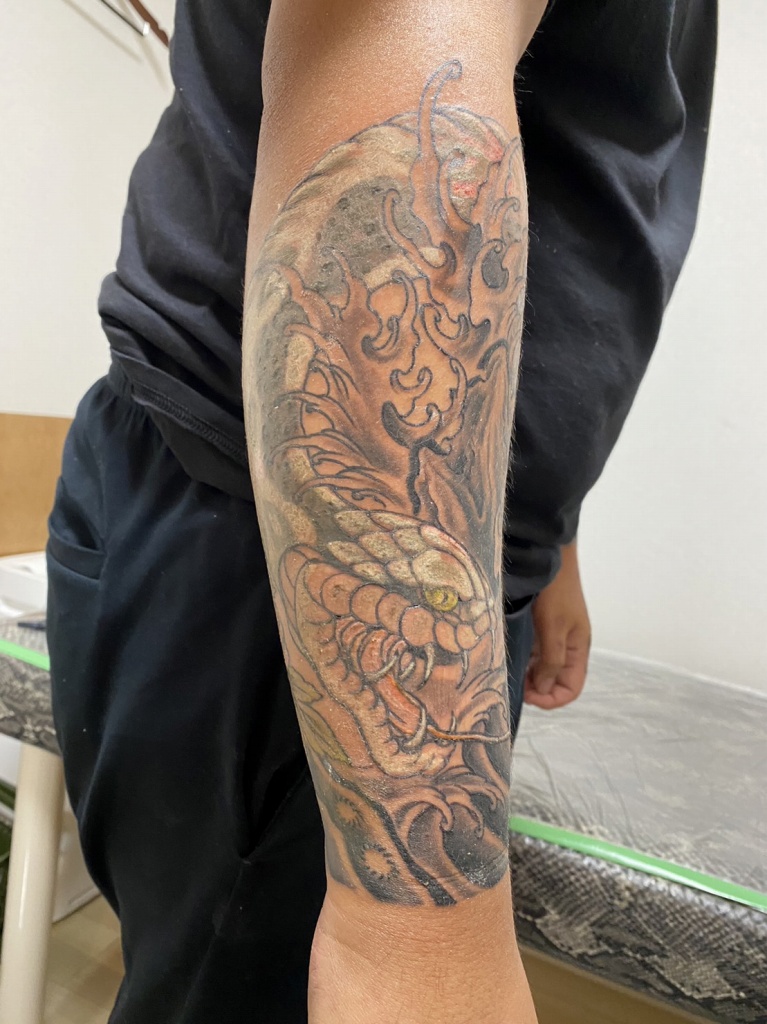 古いタトゥーの上に新たなモチーフを彫ることで過去のリフレッシュを行います。 もっと見る